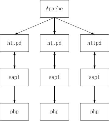在上图中,我们很清晰的可以看到,apache每接收一个请求,都会产生一个进程来连接php通过sapi来完成请求,可想而知,如果一旦用户过多,并发数过多,服务器就会承受不住了。